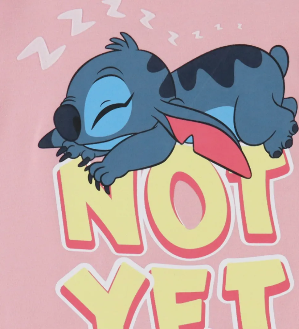 Flot Name It natkjole i lys rosa, med et flot print af en sovende Stitch og teksten “Not Yet”.