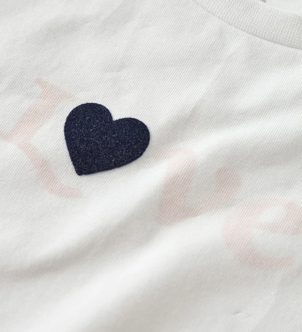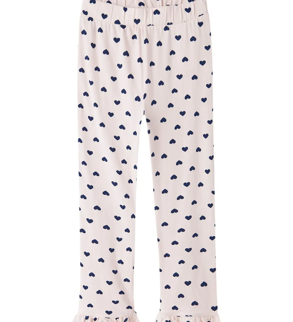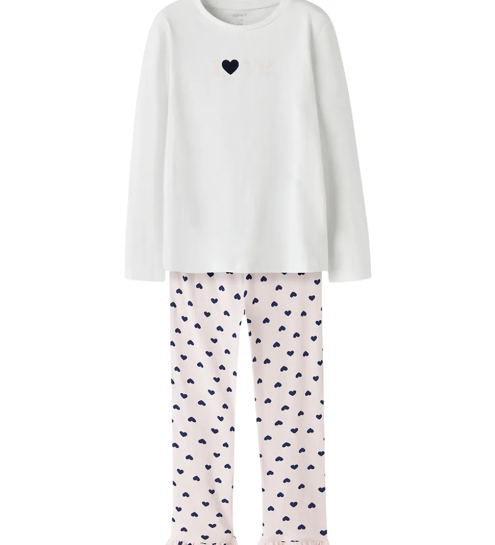 Sødt Name It nattøj bestående af en natbluse og et par natbukser. Natblusen er hvid og har et print på fronten med teksten “Love” i rosa og navyblå. Den har en rund halsudskæring med en smal ribkant og lange ærmer. Natbukserne er rosa og har et alloverprint af navyblå hjerter. De har en god elastik i taljen, og i benåbningerne er der fine flæsekanter.
