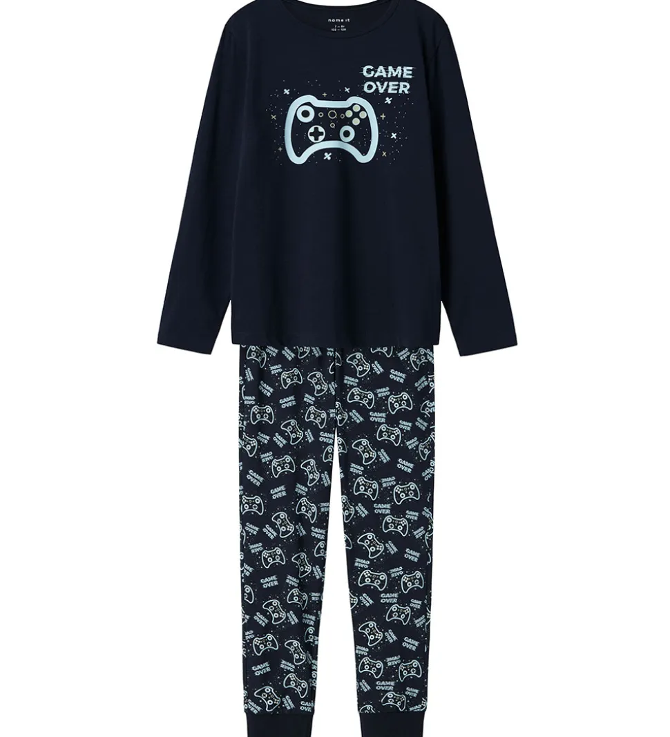 Skønt Name It nattøj, som er 2-delt med en natbluse i navyblå med et gaverprint på fronten samt et par natbukser i navyblå med et allover-gamerprint, der sikrer en god nat.