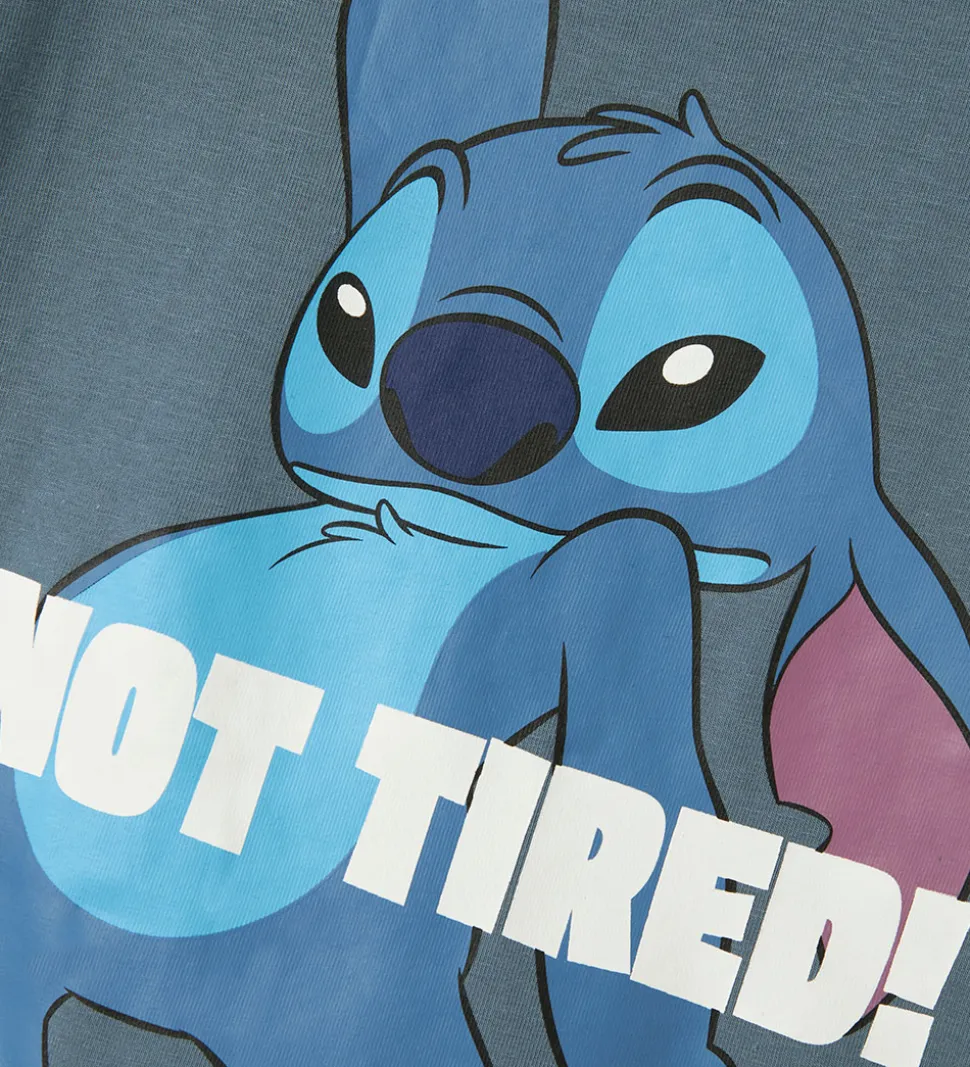 Charmerende Name It nattøj i en flot, blå farve med korte ærmer. T-shirten prydes af et stort print med Stitch og teksten “Not Tired!”, der genskabes på shortsene. Name It sikrer sjovt nattøj.