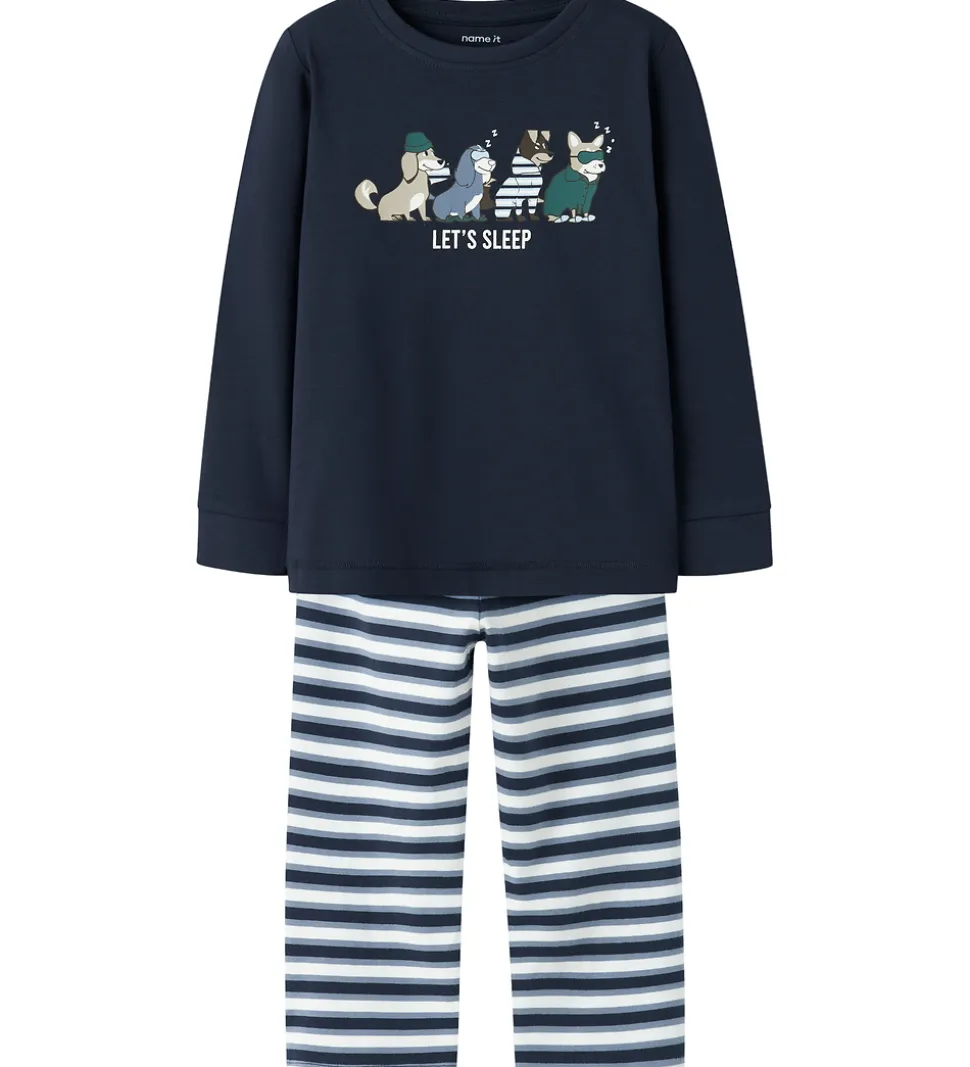 Skønt Name It nattøj bestående af en langærmet natbluse i navyblå og et par natbukser i stribet hvid, støvet blå og navyblå. Natblusen har et print af hunde med nattøj, natbriller og en pude samt teksten “Let’s Sleep”. Den har en rund halsudskæring med en smal ribkant og ribkanter ved håndleddene. Natbukserne har en god elastik i taljen og lige ben.