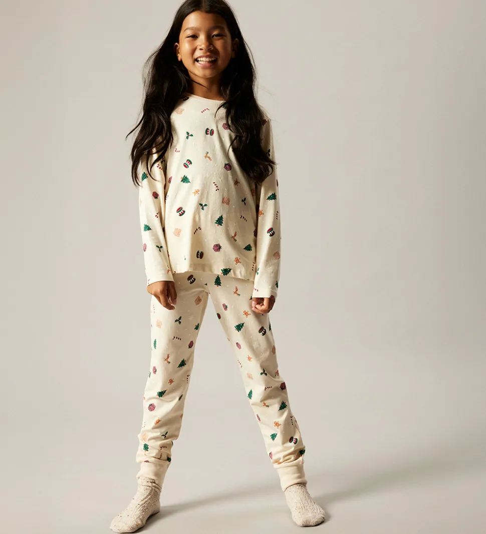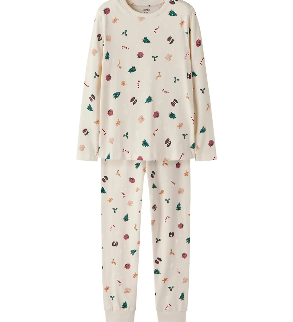 Lækkert Name It nattøj i råhvid med et alloverprint af julemotiver. Nattøjet består af en langærmet natbluse og et par natbukser med elastik i taljen og ribkanter ved anklerne.