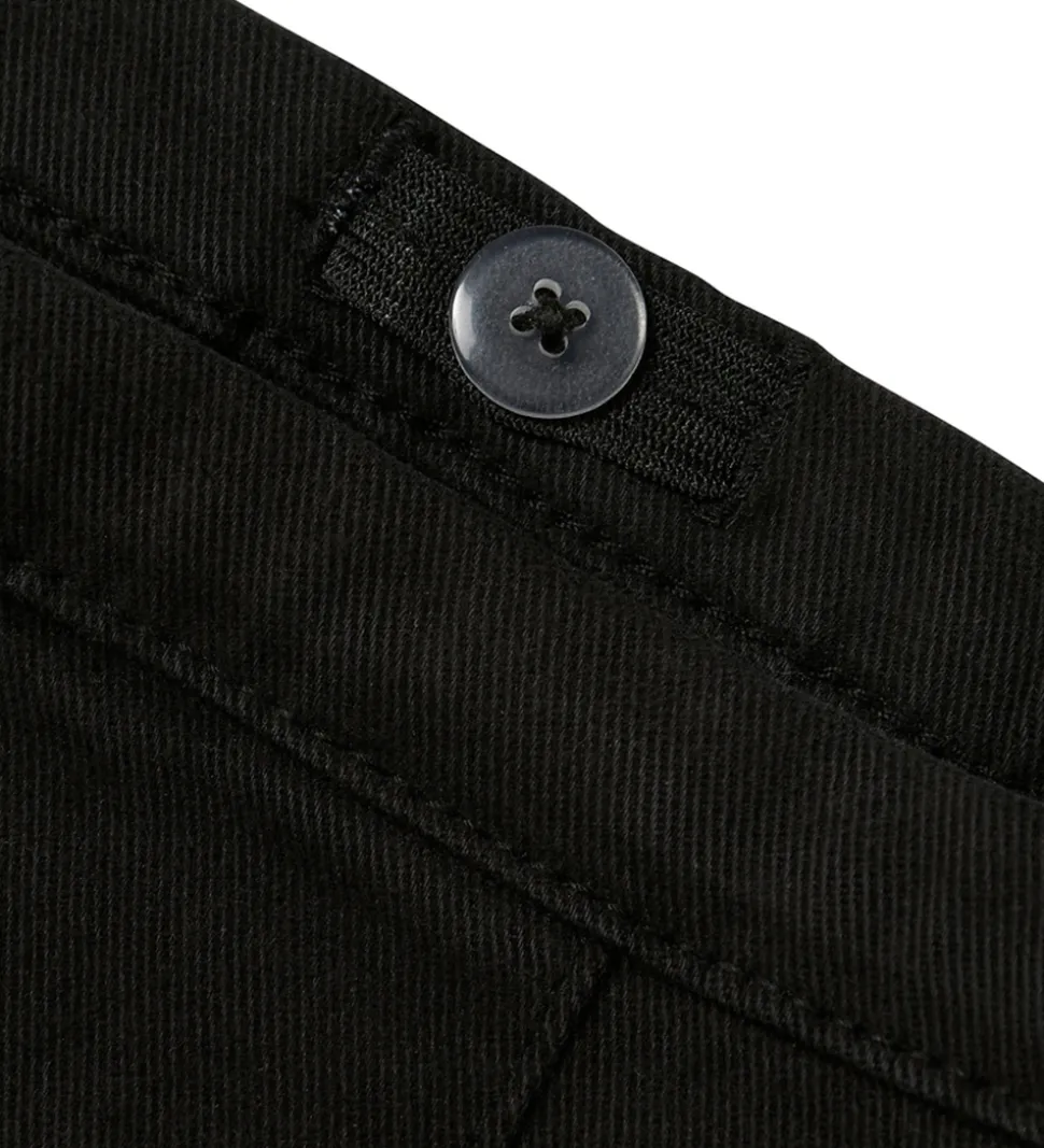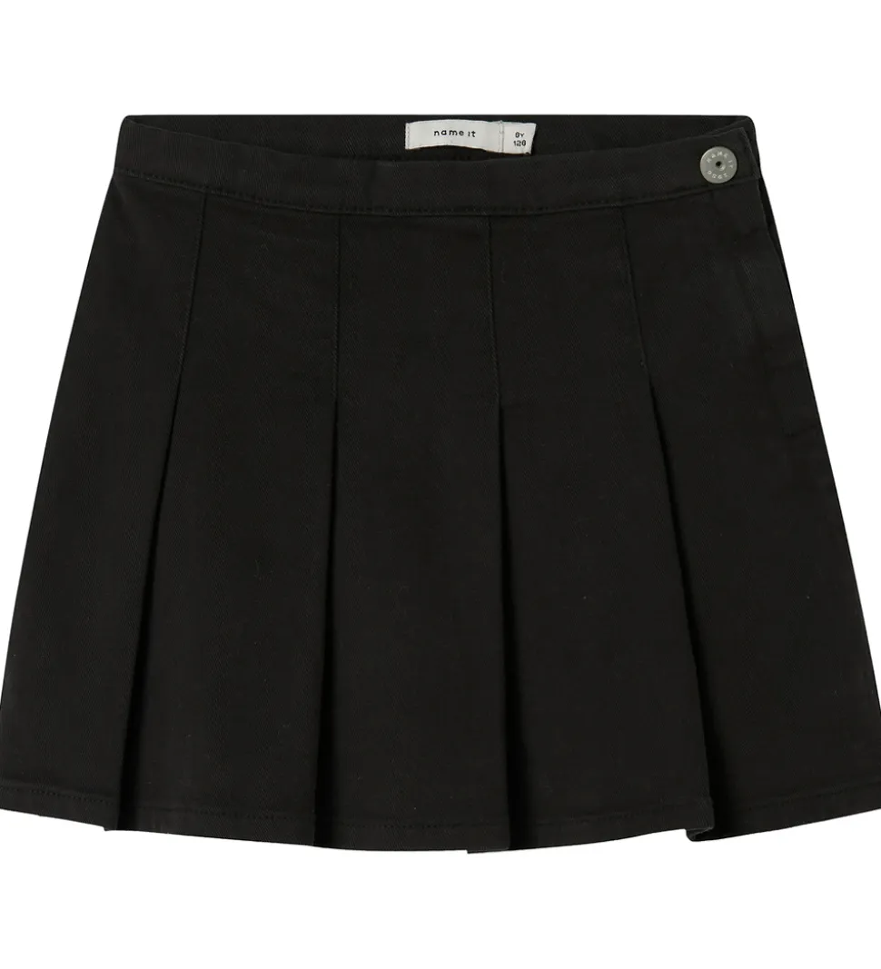 Elegant Name It nederdel i sort denim med et klassisk plisseret design. Name It nederdelen har en justerbar talje med knapper indvendigt. Den lukkes i venstre side med en hægte og lynlås.