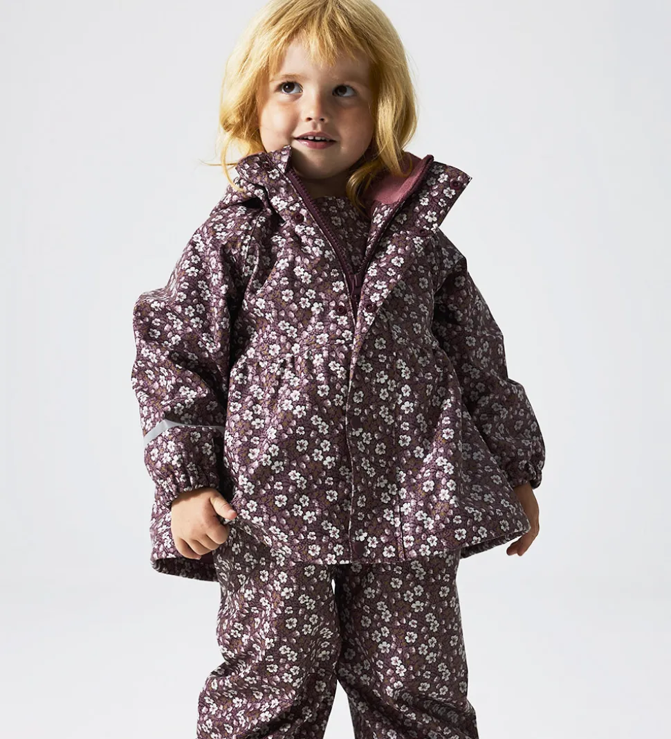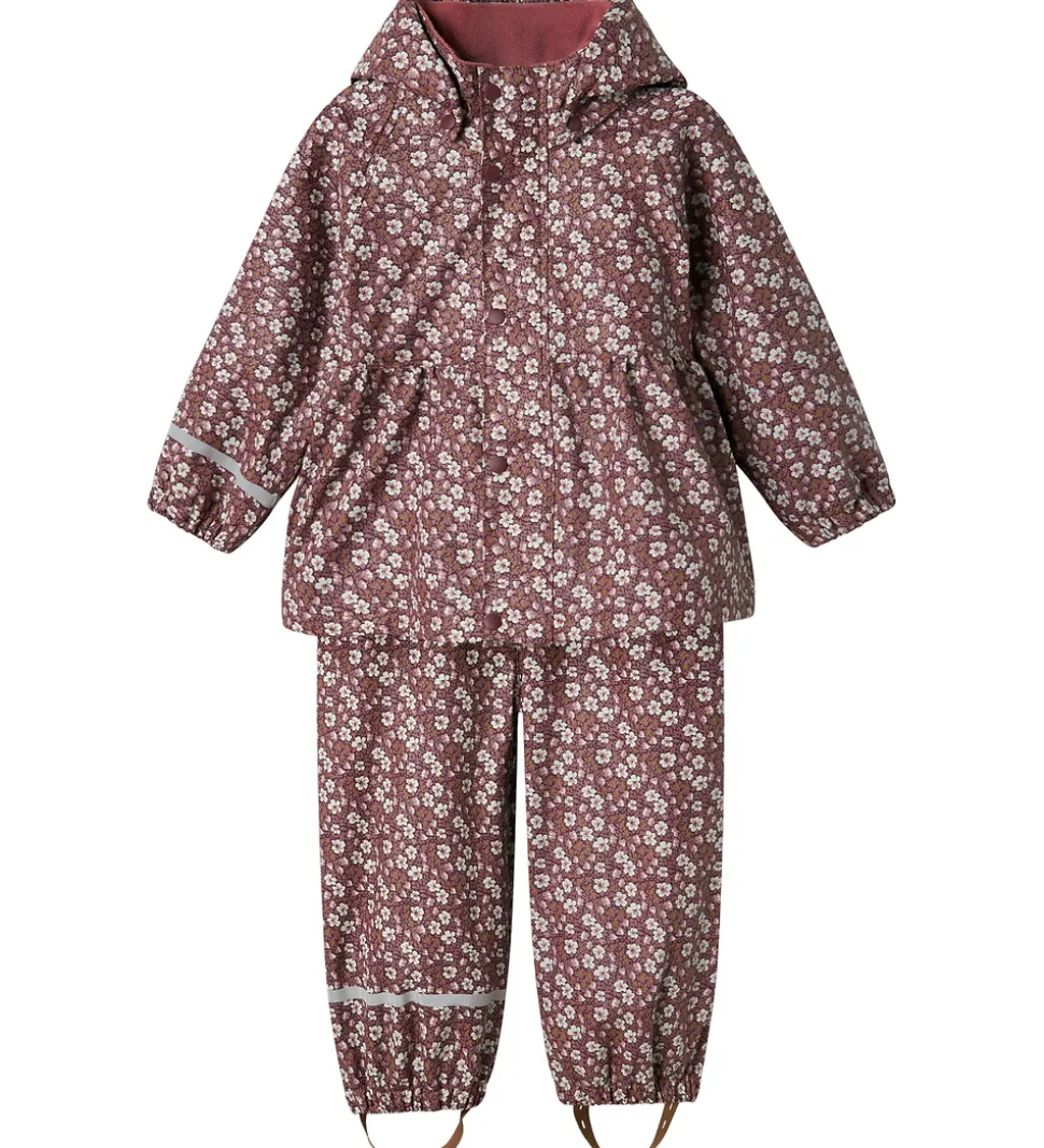 Flot Name It regntøj bestående af en regnjakke og et par regnbukser i et småblomstret alloverprint i lilla, rosa og hvid. Regntøjet har også diskrete refleks-logoprint.