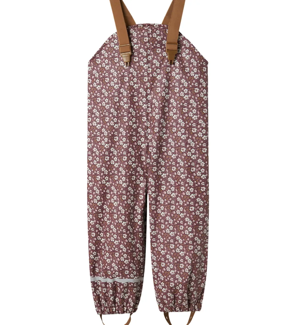 Name It regnbukserne regnjakken har dekorative rynker hele vejen rundt i livet, hvilket giver et fint snit. Den har elastiske seler, som kan justeres i længden, og de åbnes med klikspænder fortil. I ryggen er der en smal elastik, som sikrer en god pasform.