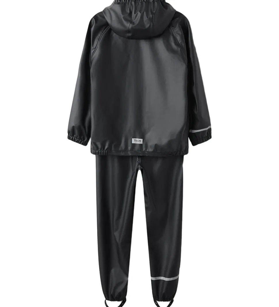 Flot Name It regntøj af PU bestående af en regnjakke og et par regnbukser i navyblå med et lille reflekslogo på venstre bryst og nederst på ryggen.