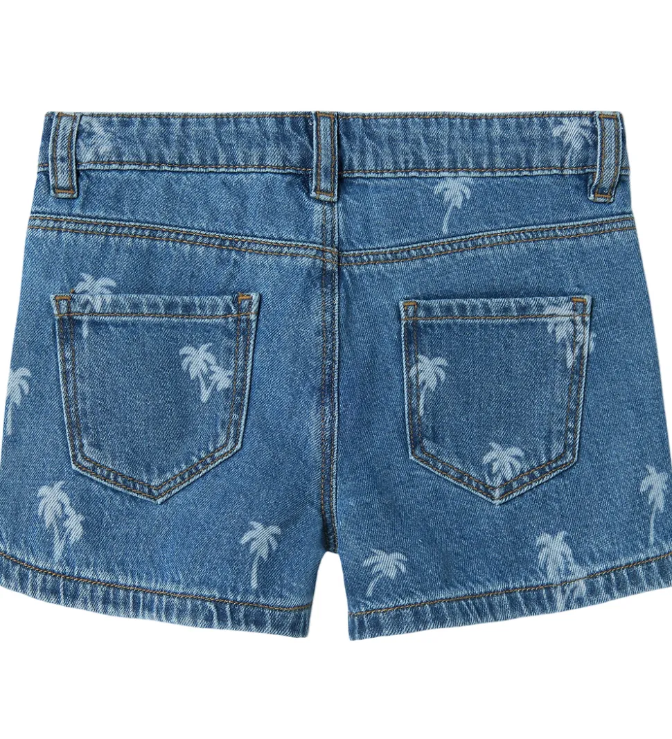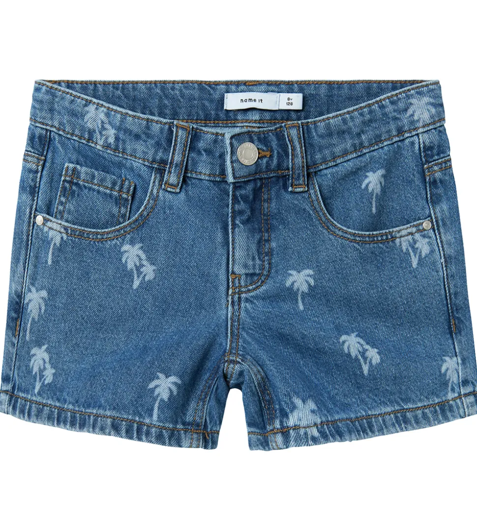 Stilfulde Name It shorts i mørkeblå denim med et diskret allover palmeprint i hvid, der giver et friskt, sommeragtigt udtryk.