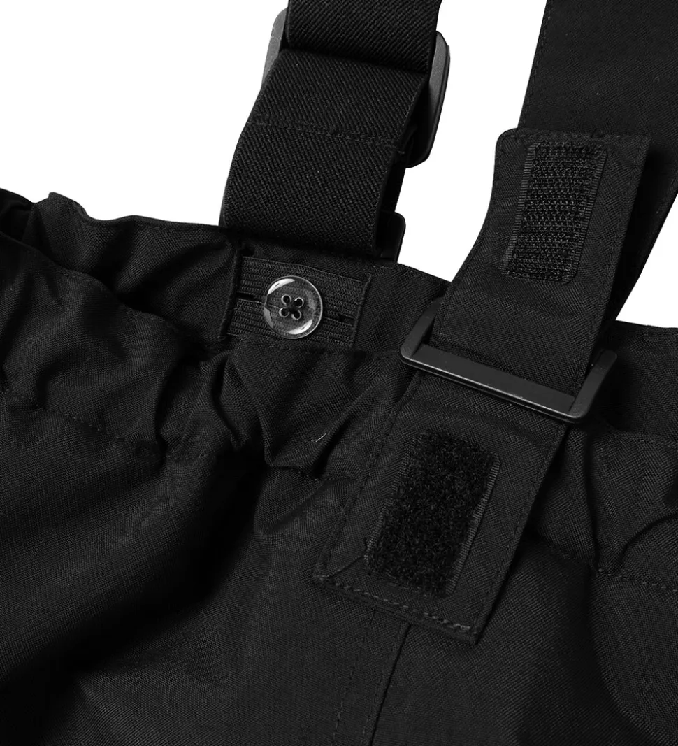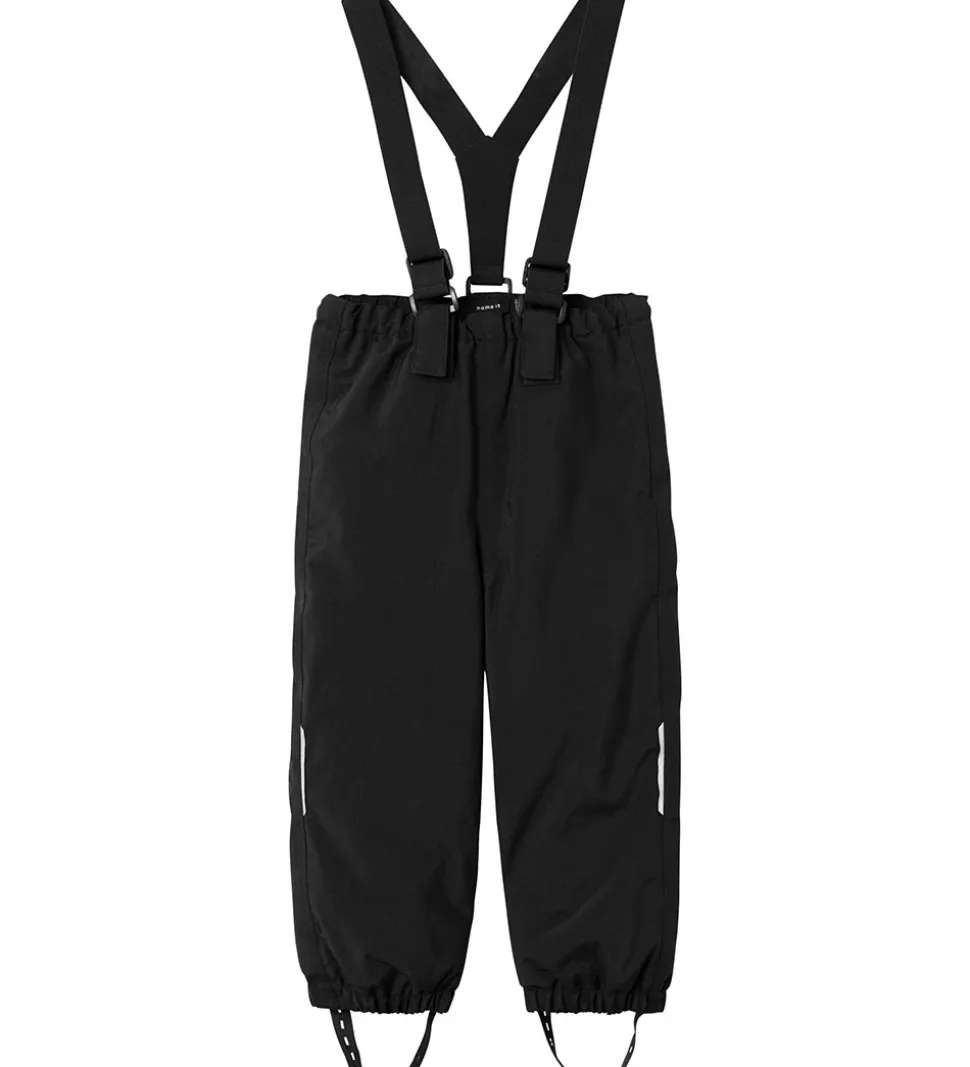 Name It skibukserne har justerbare elastikseler, som samles på ryggen. Selerne sidder fast med velcro, så de kan fjernes, hvis man ønsker det. I livet kan de strammes ind med på indersiden med elastikbånd og knapper, og buksebenene elastikkanter i åbningerne samt aftagelige, justerbare elastikstropper til at sætte under fodtøjet.