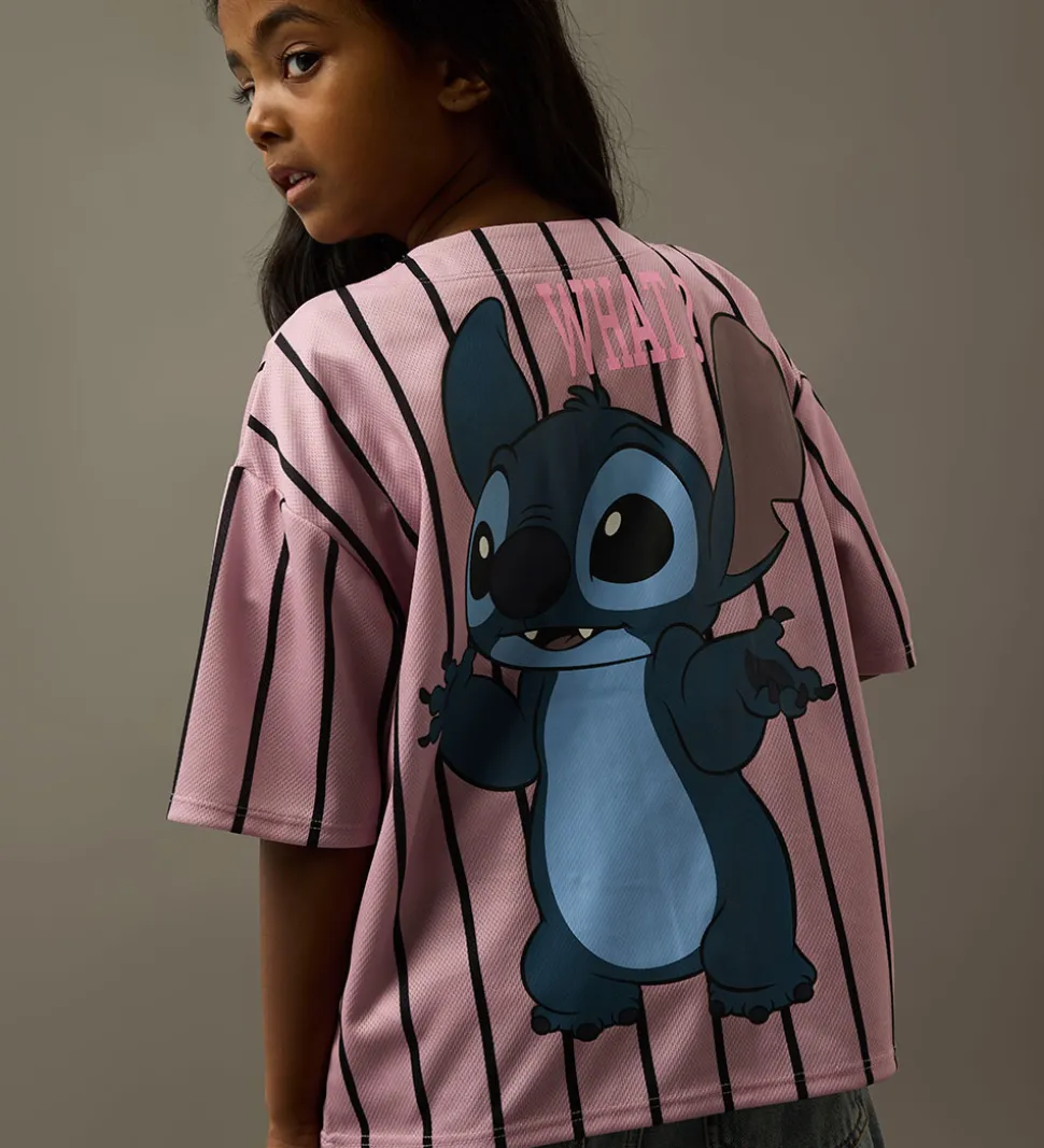 Stilfuld Name It skjorte med sporty design. Skjorten er rosa med sorte striber og et Stitch-print på venstre bryst og på ryggen. Den har korte ærmer og gennemgående knapper fortil.