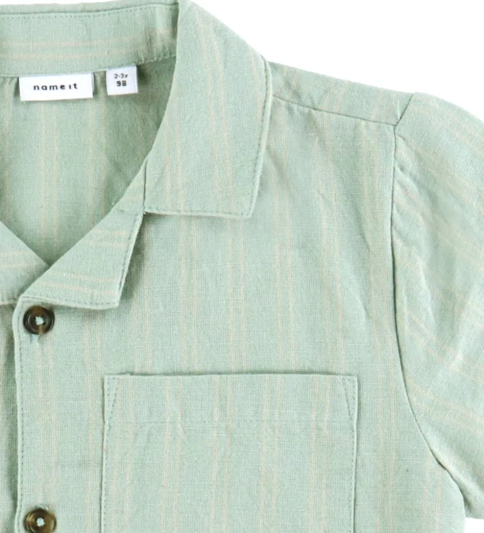 Elegant Name It skjorte i lysegrøn med diskrete striber i beige. Skjorten har korte ærmer og en klassisk krave. På forsiden er der fem mørke knapper samt en praktisk brystlomme. Den lette struktur gør denne Name It skjorte til et behageligt valg til forskellige anledninger.