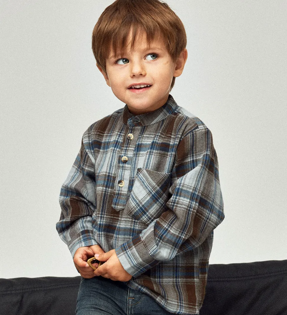 Skøn skjorte fra Name It i et ternet mønster i brune og blå nuancer. Skjorten har en traditionel krave og lange ærmer. Skjorten har gennemgående knaplukning fortil og en brystlomme i venstre side. Skjorten er fremstillet i en blød bomuldskvalitet.