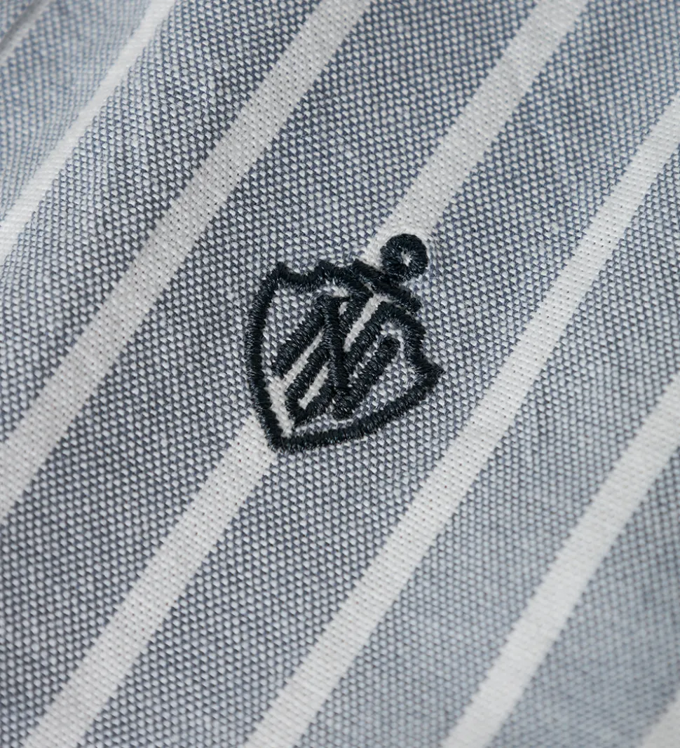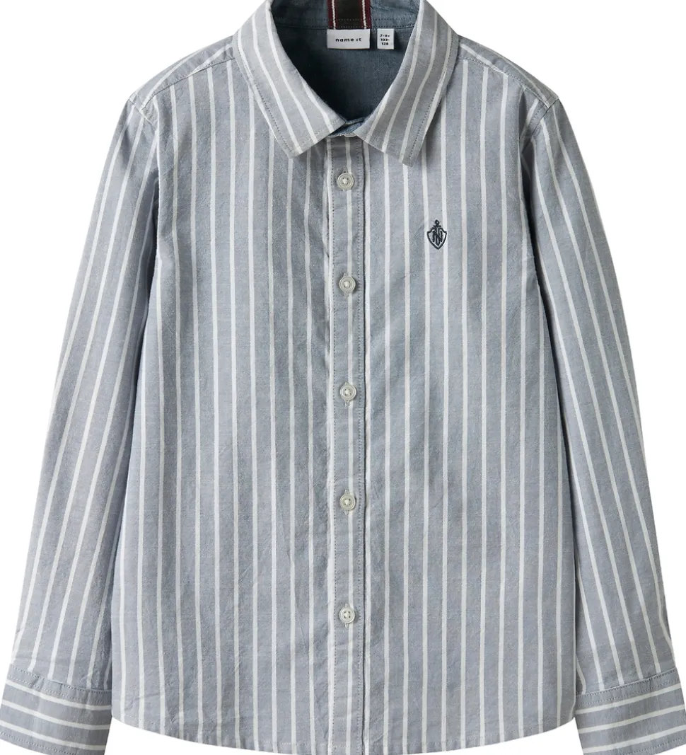 Stilfuld Name It skjorte i en gråblå nuance med klassiske hvide striber. Skjorten har lange ærmer og en traditionel krave, der giver et tidløst look. Name It skjorten er prydet med en diskret logo detalje på brystet, som tilføjer et moderne touch.