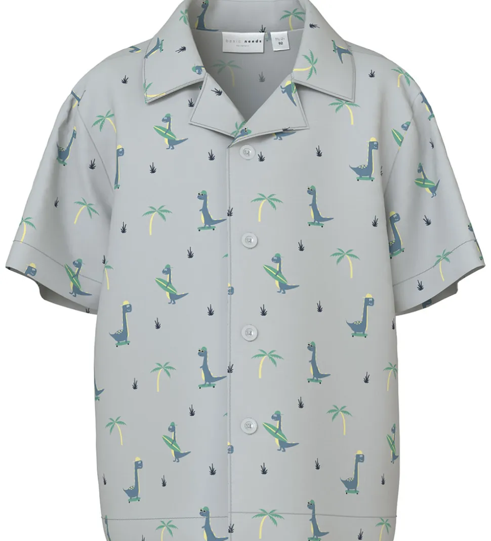 Flot Name It skjorte med korte ærmer i en lys grå farve med sjovt dino- og palmetræprint over det hele. Skjorten har knaplukning, der gør den let at tage på og af.