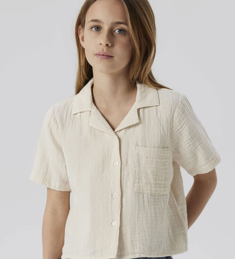 Fin Name It skjorte i en lys sandfarve med korte ærmer, der har en enkel knaplukning og en praktisk lomme på brystet. Det gør skjorten både stilfuld og funktionel for de små.