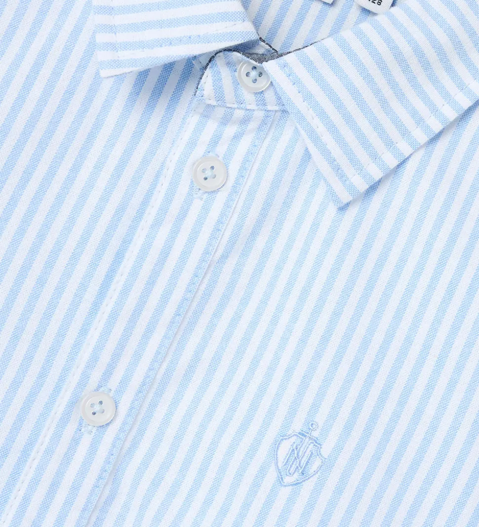 Flot Name It skjorte med korte ærmer i en lys blå farve med fine striber. Skjorten har en klassisk krave og knaplukning, samt en lille logopatch på brystet.