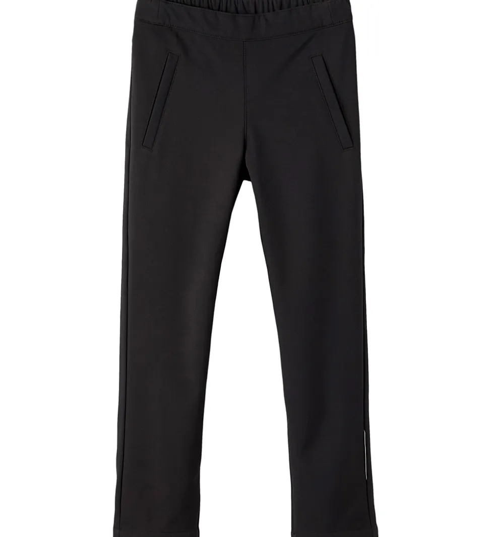 Smarte Name It softshellbukser i ensfarvet sort, med reflekser på ydersiden af begge bukseben.