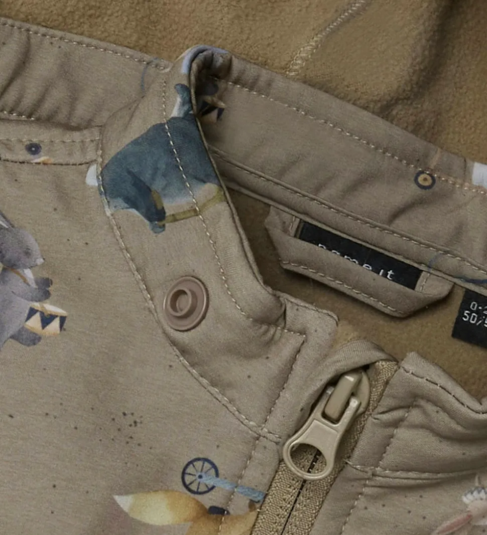 Dejlig Name It softshelldragt i en varm, lysebrun nuance med et charmerende print af dyr, der cykler og leger.