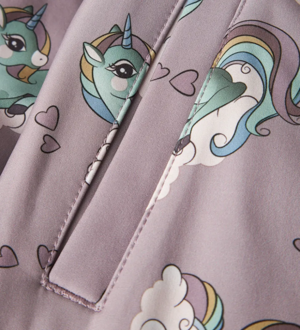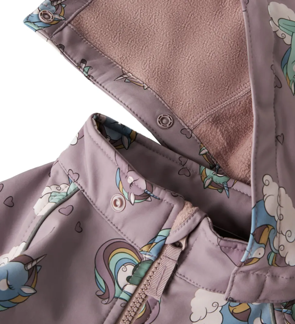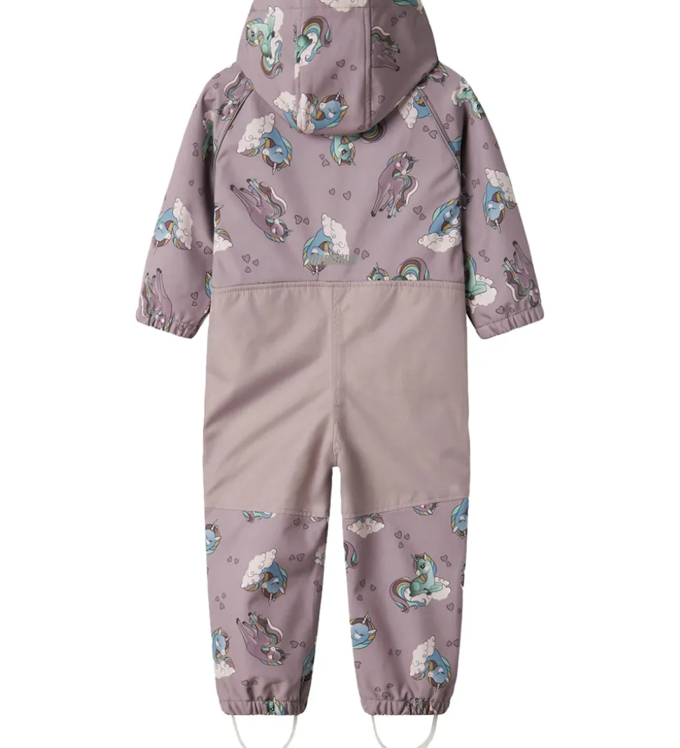 Sød Name It softshelldragt i støvet lilla med et fint alloverprint af enhjørninger på skyer samt små hjerter.