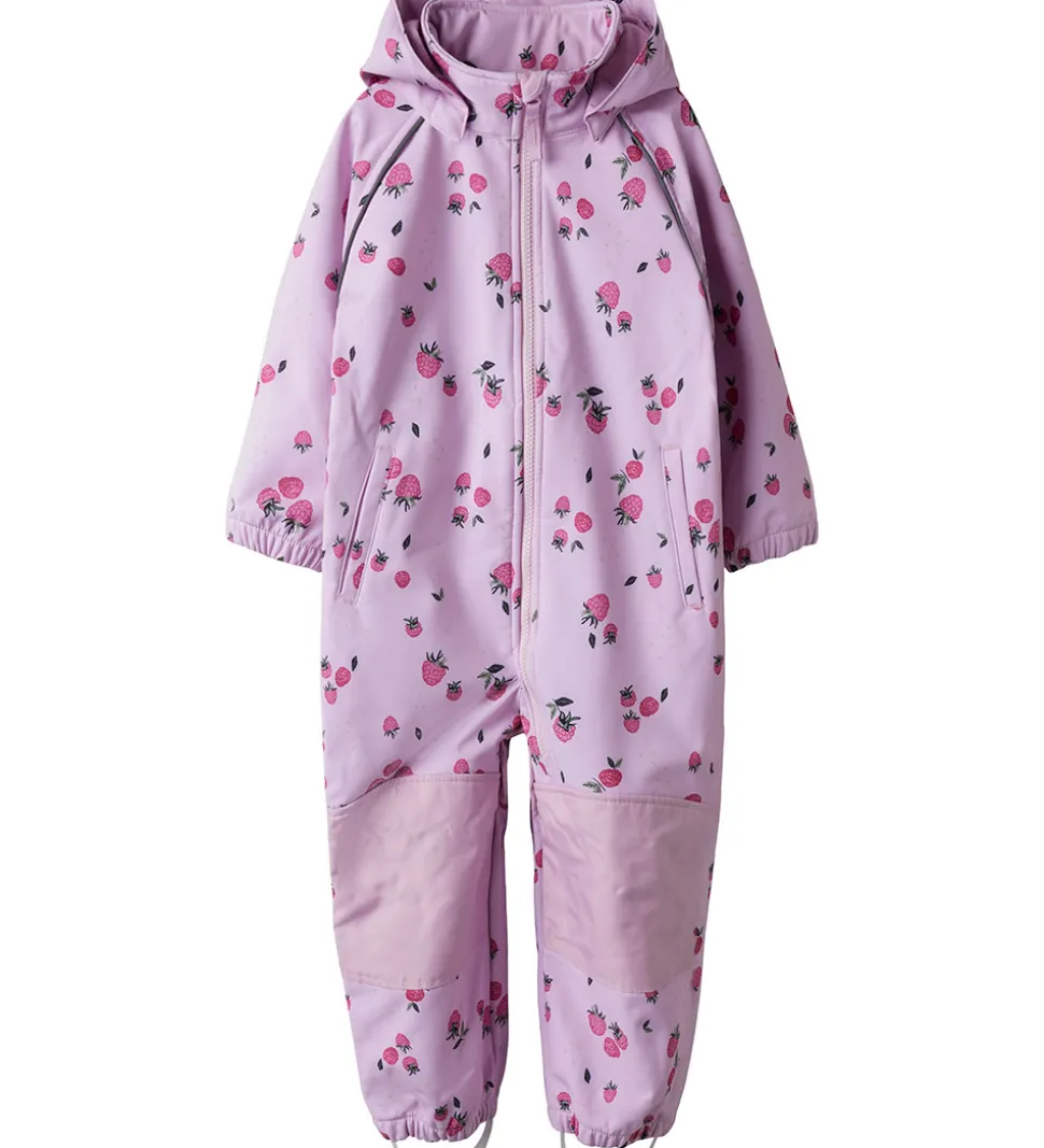 Dejlig Name It softshelldragt i rosa med et alloverprint af hindbær.
