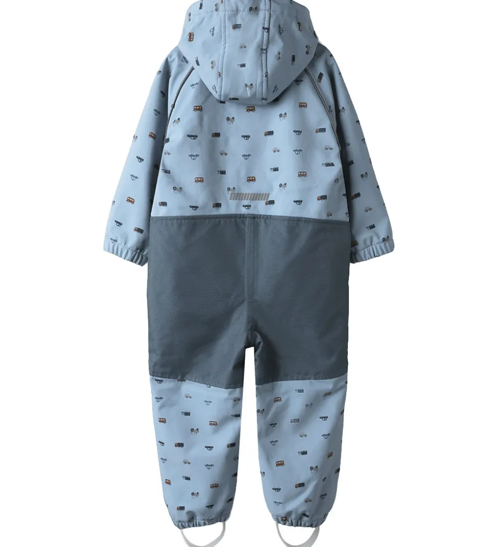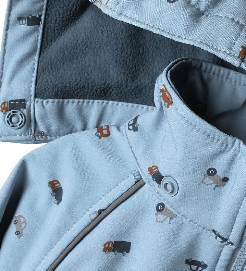 Dejlig Name It softshelldragt i lys, støvet blå med et alloverprint af biler i grå, blå og brune farver.