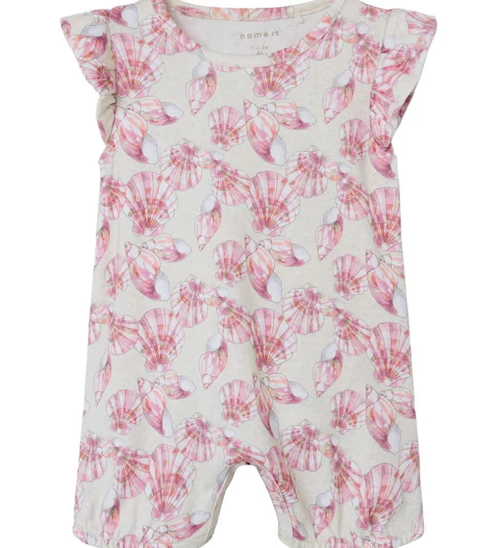 Fin sommerdragt i meleret beige, med et smukt allover print af forskellige muslingeskaller i hvid, beige og rosa nuancer.