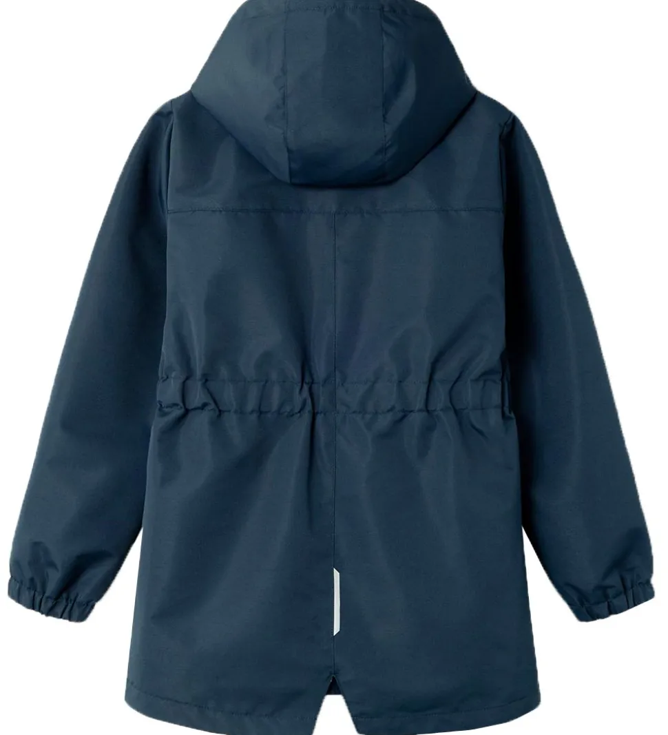 Name It sommerjakken har en aftagelig hætte, som fæstnes med trykknapper og velcro langs den høje halskrave. I ærmeåbningerne er der praktiske elastikkanter. I livet er der en bred elastikkant, så den får en mere figursyet pasform.