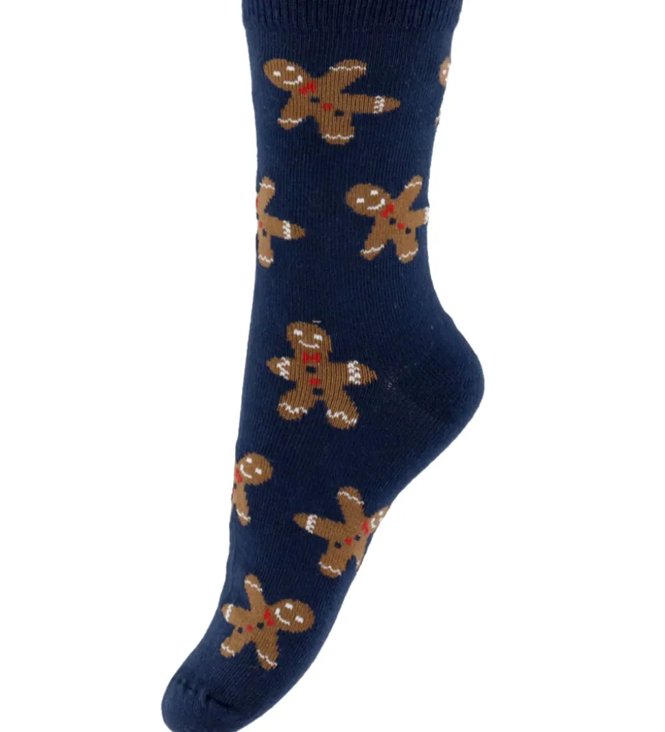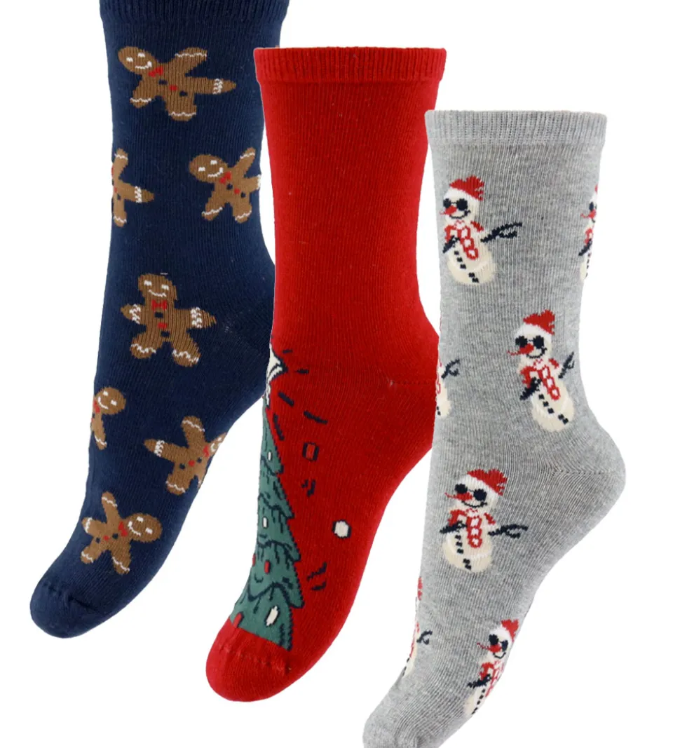 Festlige Name It strømper solgt i en 3-pak i navy med brune peberkagemænd, røde med juletræsmotiv og grå med snemænd. Name It strømperne har en ribkant øverst, som sikrer en god pasform.