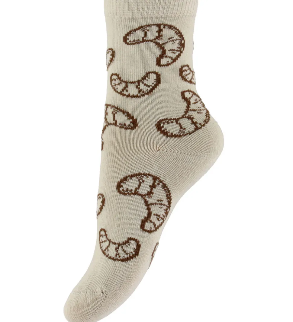 Smarte Name It strømper solgt i en 3-pak. Sættet indeholder strømper i blå med et croissant-motiv, beige med croissant-print, samt et beige og blåstribet par. Alle strømper har en smal elastisk ribkant øverst for en god pasform.