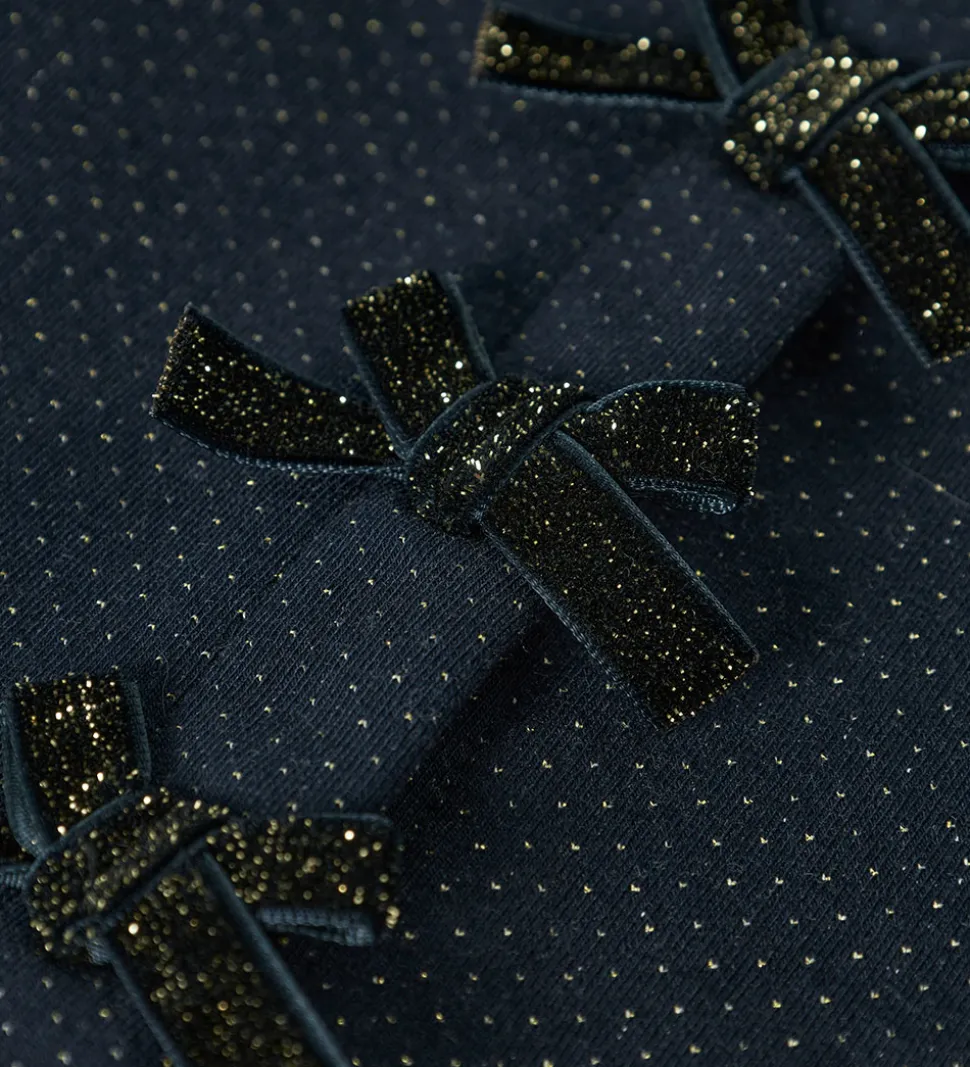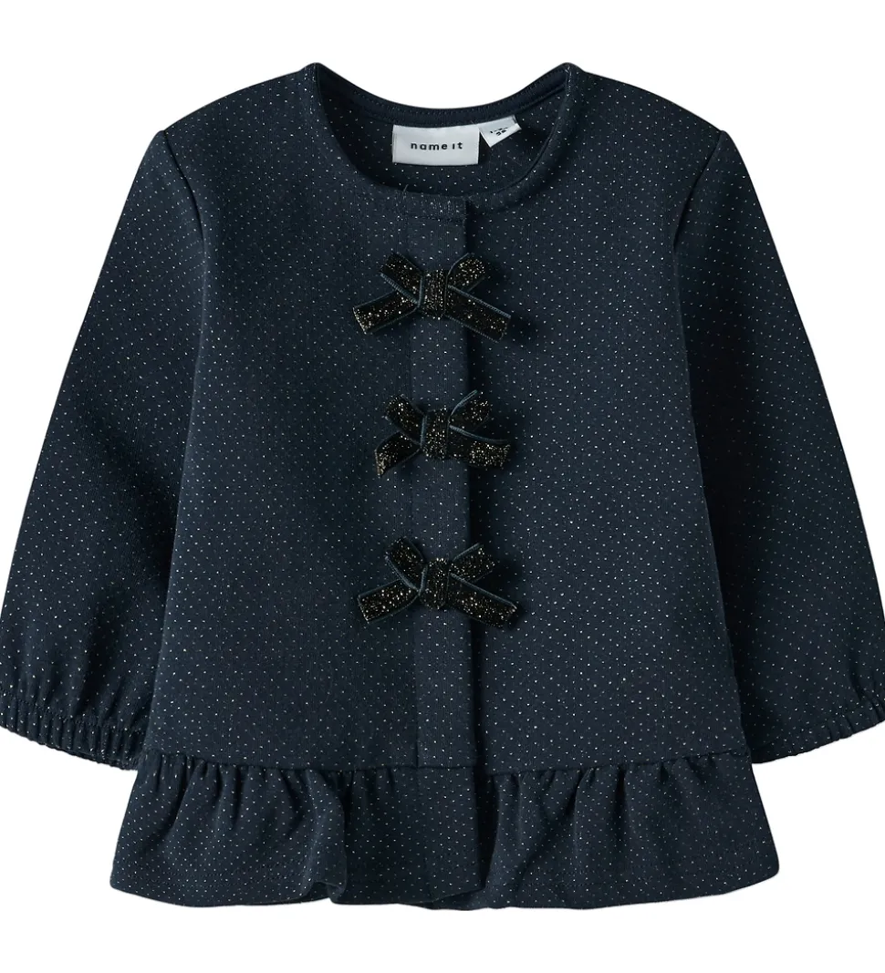 Stilfuld Name It cardigan i navyblå med glimmer og fine sløjfer foran. Cardiganen har en rund halsudskæring og gennemgående trykknapper foran. Den har elatisk i ærmeåbningerne og en flæsedetaje ved taljen.