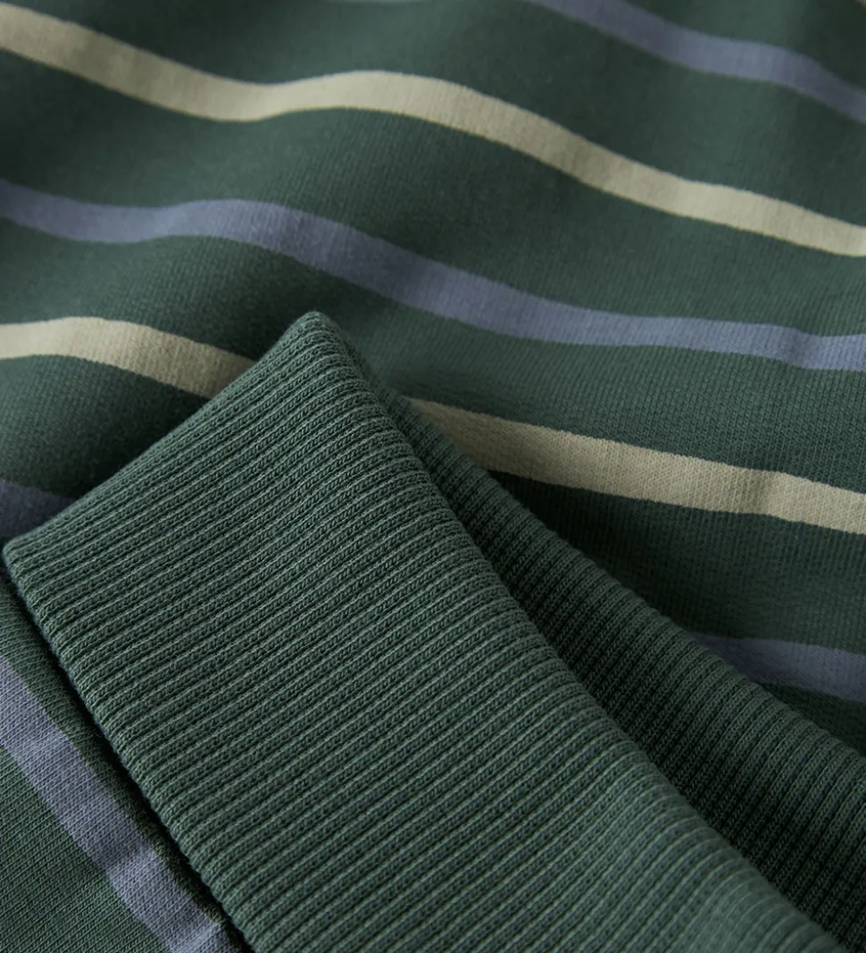 Flotte Name It sweatpants i mørkegrøn med vandrette striber i blå og beige. Sweatpantsene har en bred ribkant i taljen, som kan bukkes ned. I benåbningerne er der ribkanter, og indvendigt er der blødt, børstet bomuld.