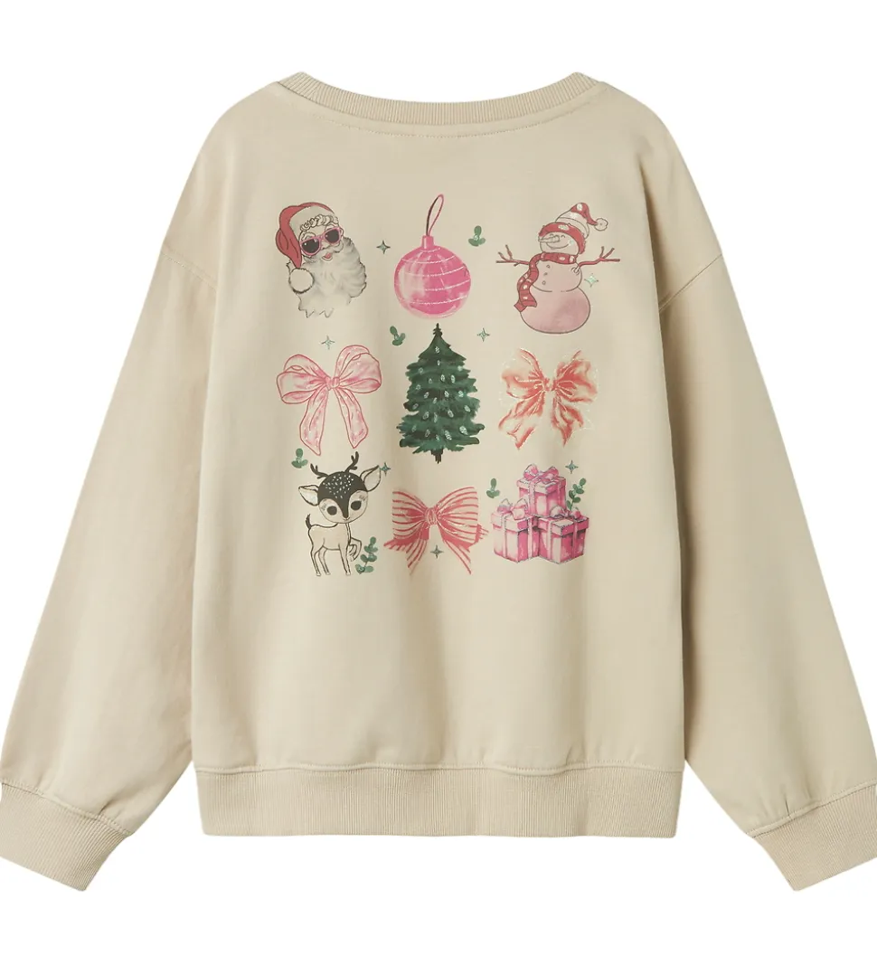 Flot Name It sweatshirt i en lys beige nuance med print af en sløjfe i rød og sølv glimmer på det ene bryst. På ryggen er der print af forskellige, hyggelige julemotiver. Name It sweatshirten har en rund halsudskæring og lange ærmer. Indvendigt er der blødt, børstet bomuld.