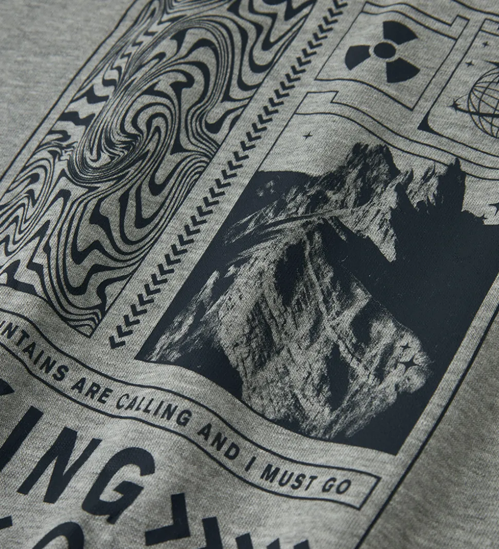 Stilfuld Name It sweatshirt i meleret grå, med et stort print på ryggen af bjerge og ikoner. Name It sweatshirten har en rund hals og lange ærmer. Den har et diskret “Hiking Club” print langs siden, hvilket tilføjer en moderne detalje.