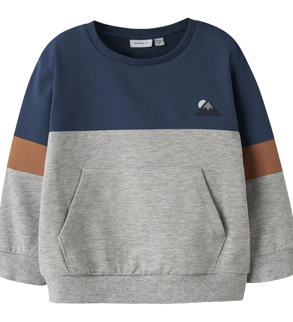 Stilren Name It sweatshirt i en kombination af meleret grå, blå og orange. Sweatshirten har et broderi på venstre bryst af et bjerg og en sol. På fronten er der en rummelig kængurulomme. Sweatshirten har rund en halsudskæring og lange ærmer med ribkanter i åbningerne. Indvendigt er der blødt, børstet bomuld.