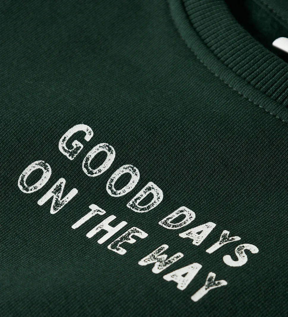 Skøn Name It sweatshirt i en dyb grøn farve med teksten “GOOD DAYS ON THE WAY” samt et traktorprint præget ind i materialet.