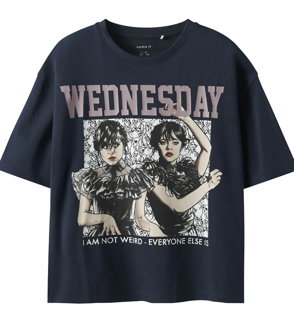 Smart Name It t-shirt i navyblå med et stort print fra Netflix-serien “Wednesday” på fronten. Name It t-shirten har en klassisk rund halsudskæring og korte ærmer.