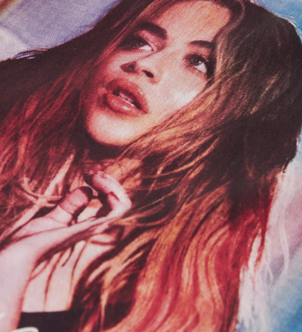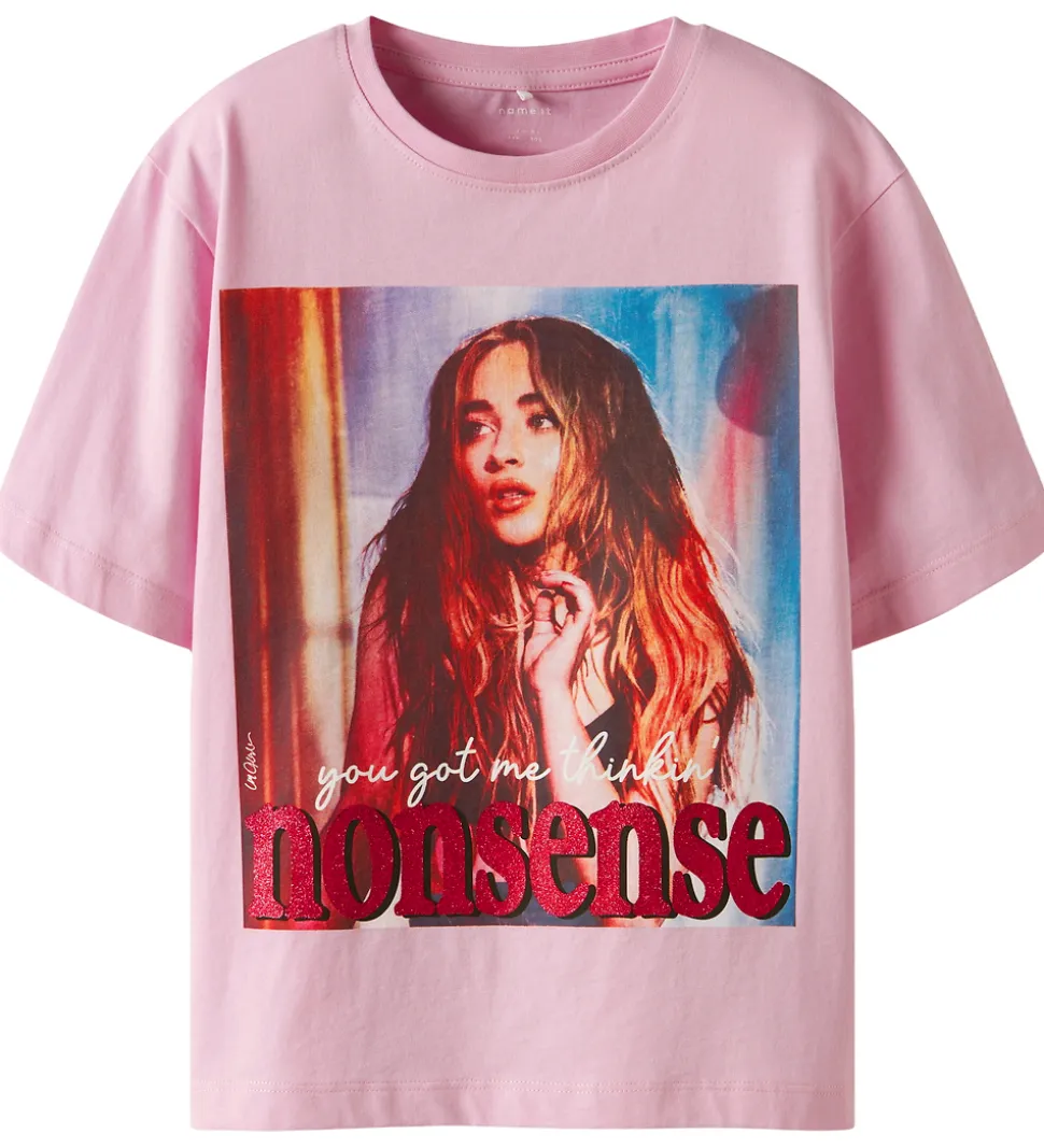 Fin Name It t-shirt i en sart, rosa farve med et markant fotoprint på fronten med en person og teksten “you got me thinkin’ nonsense” i hvid og rød skrift.