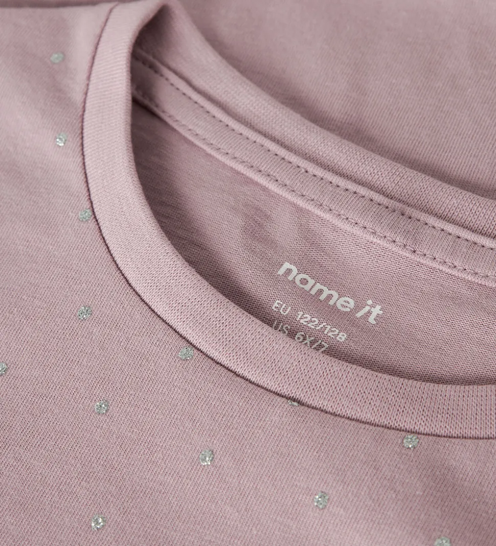 Stilren Name It t-shirt i en rosa nuance, med prikker i sølvglimmer fortil og på ærmerne. Name It t-shirten har en rund halsudskæring med en smal ribkant, hvilket fremhæver det enkle design.
