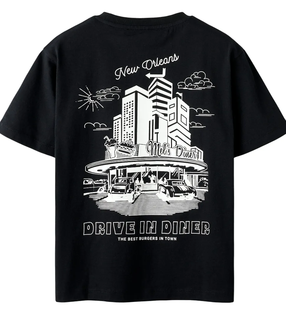 Smart Name It t-shirt i sort med hvidt print på brystet med teksten “Drive In Diner” og en lille grafisk detalje. På ryggen er der et stort, hvidt print af en diner samt tekstprint. Name It t-shirten har en rund halsudskæring med en smal ribkant og korte ærmer.