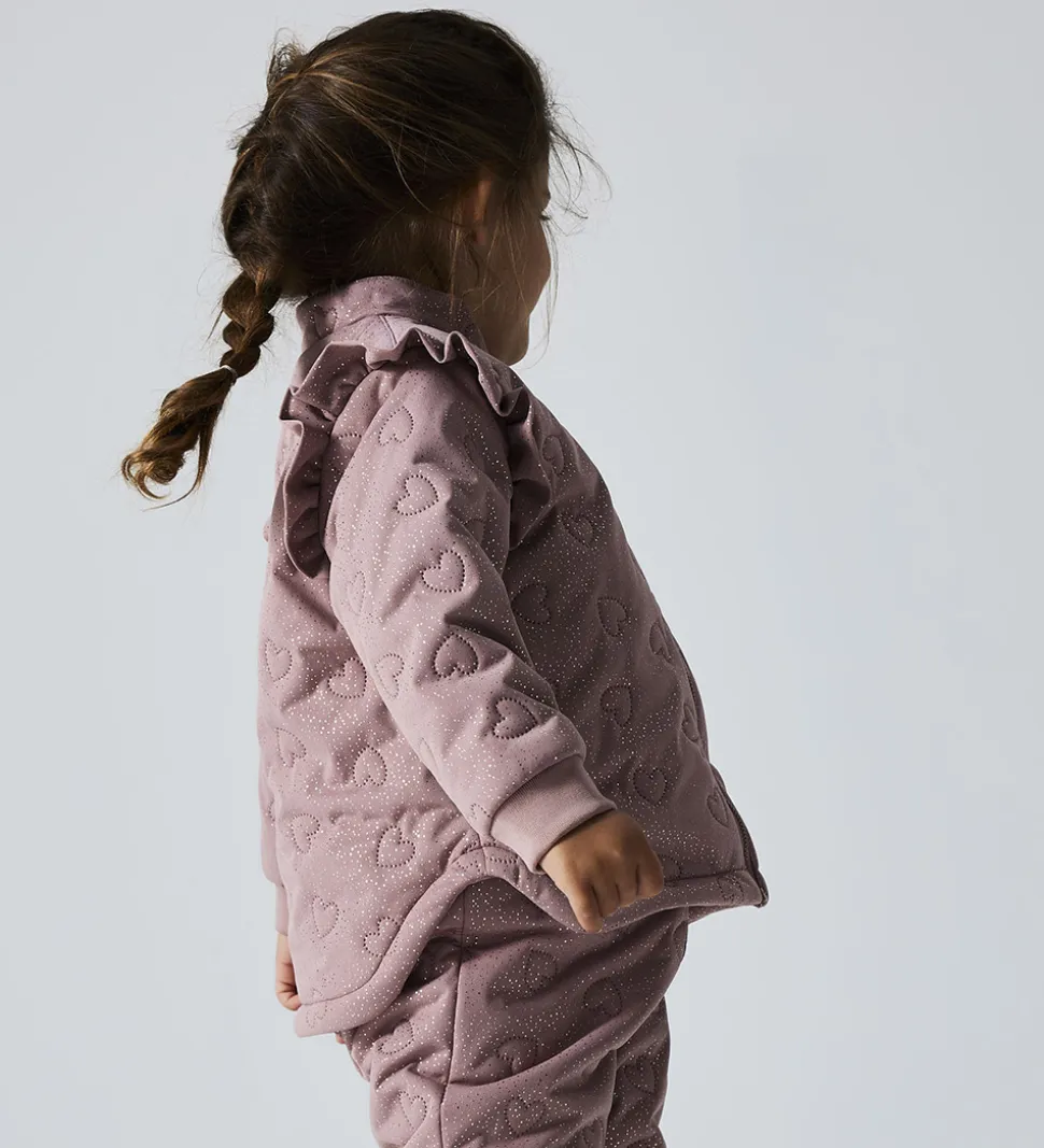 Sejt Name It termotøj i rosa med guldglimmerprikker samt en quiltet struktur i et hjerte-mønster.
