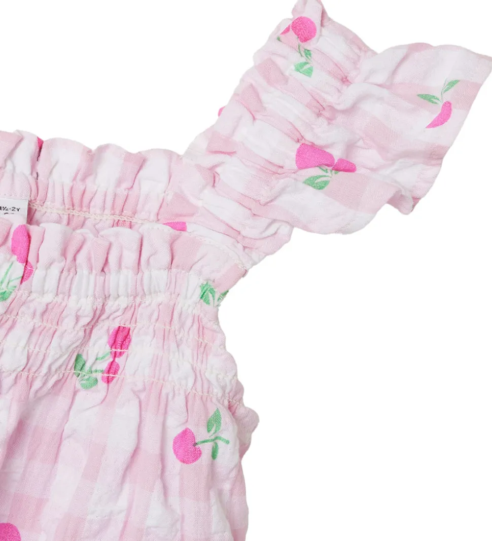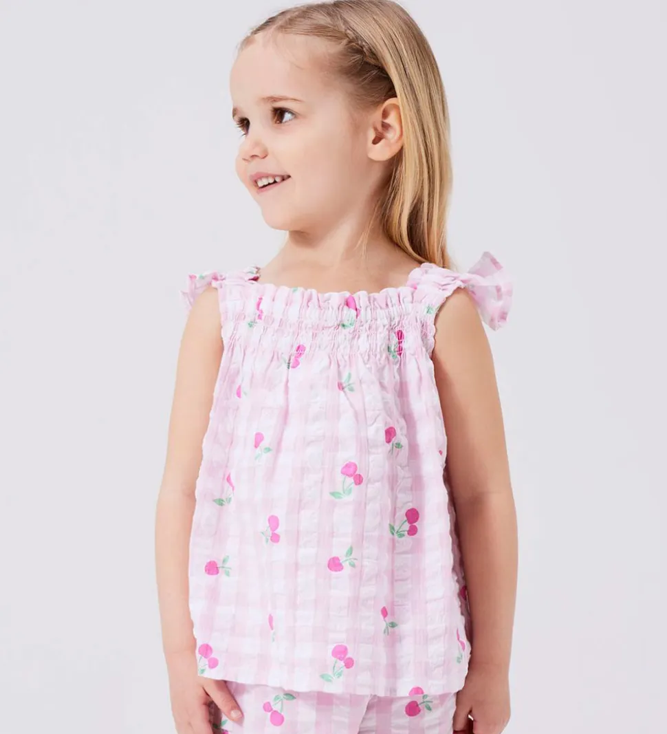 Skøn Name It top i et flot ternet design i hvid og lys rosa og med et allover kirsebærprint i grøn og rosa.