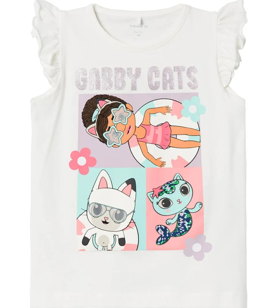 Skøn Name It top i hvid med et skønt og farverigt Gabby´s Dollhouse print på fronten, hvor dele af printet er med glitter.