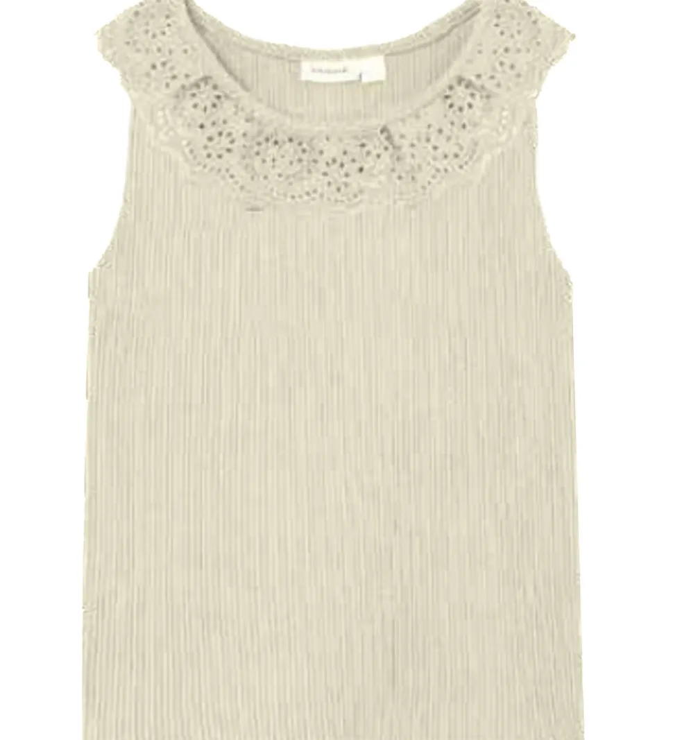 Sød Name It top i cremefarvet rib og med en flot flæsekrave i broderi anglaise.
