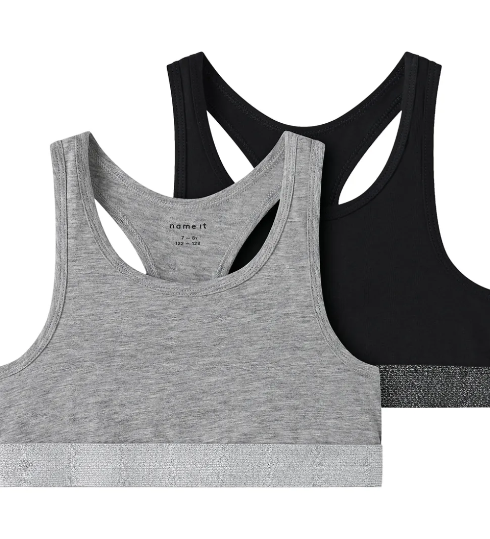 Klassiske Name It toppe i en pakke med to, hvor én top er i en stilren sort, og den anden i en tidløs gråmeleret. Begge har en skinnende elastikkant, der sikrer komfort dagen igennem. Name It kombinerer stil og funktionalitet.