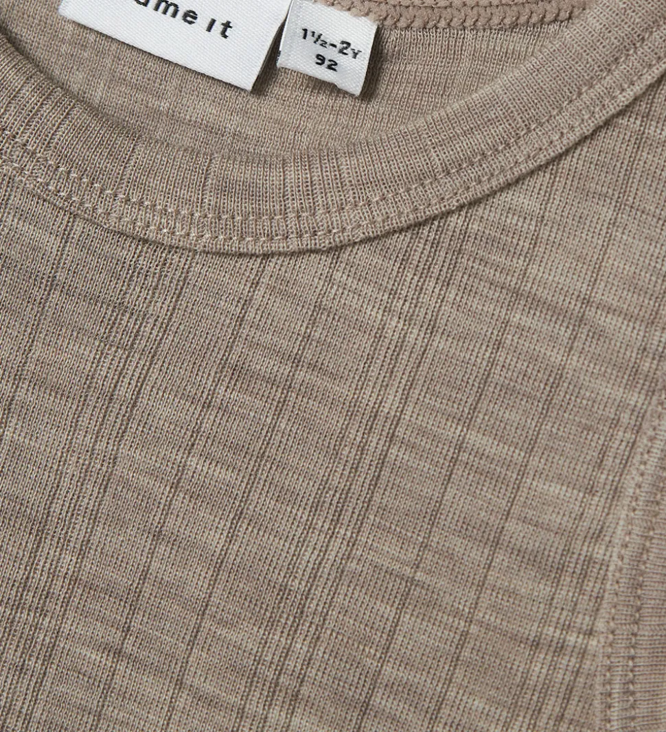 Lækker Name It undertrøje i grå med fin ribstruktur. Undertrøjen har en rund halsudskæring og brede skulderstropper. Den er fremstillet i blødt og åndbart merinould.