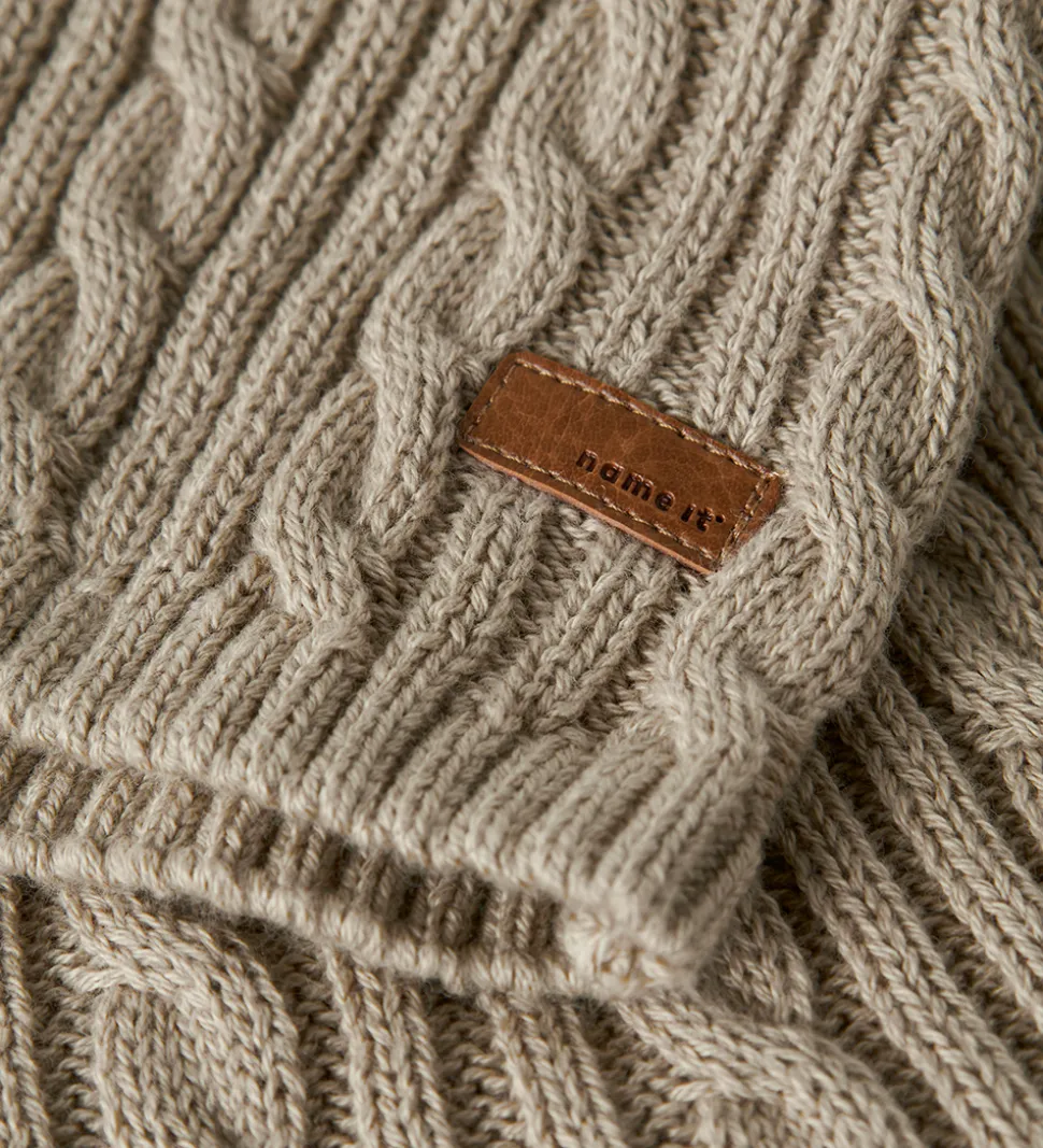 Stilfuld Name It vest i beige med flot kabelstriksdesign. Vesten har en v-udskæring i halsen og ribkanter langs alle åbninger.
