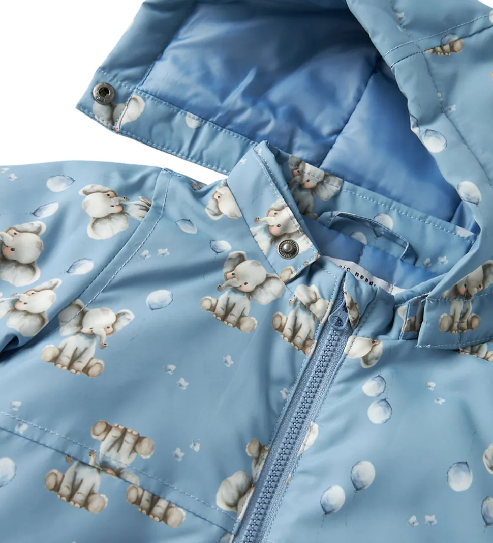Smuk Name It vinterjakke i en lys, blå farve med et bedårende print af elefanter og små ballonmotiver.