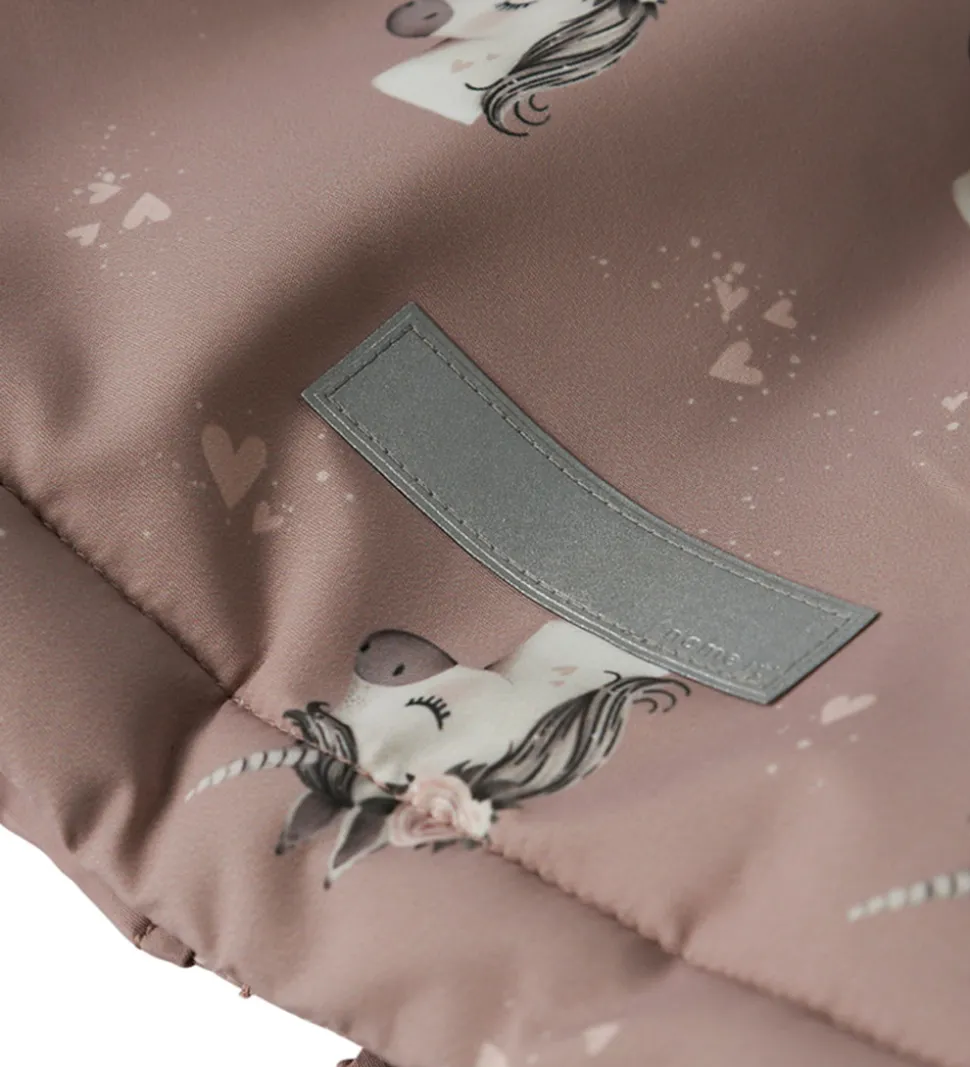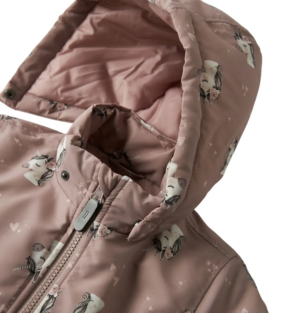 Smart Name It vinterjakke med et flot print af enhjørninger i afdæmpede nuancer. Dunjakken er i en støvet, rosa farve, der giver et blødt og harmonisk udtryk.