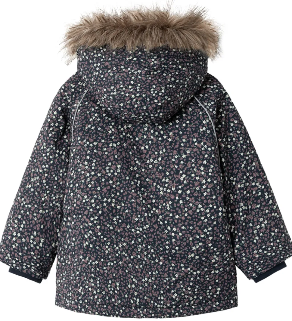 Fed Name It vinterjakke i navyblå med et allover blomsterprint, samt en flot kant af imiteret pels i brun på hætten.