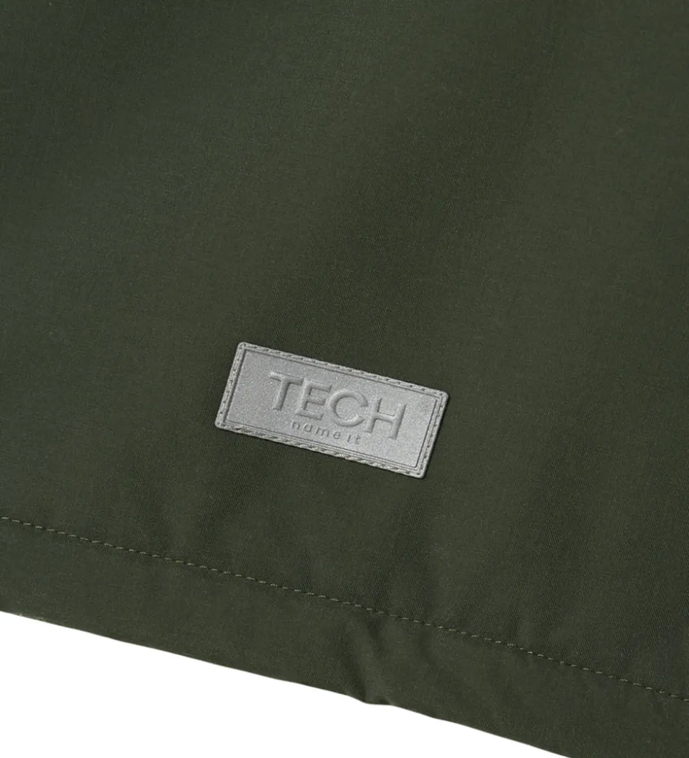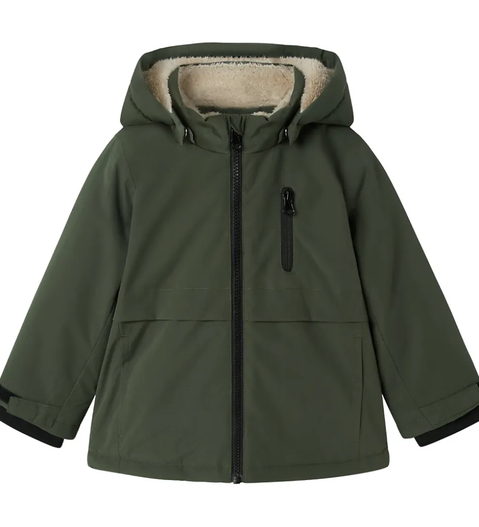 Name It vinterjakken har en aftagelig hætte, som sidder fast med trykknapper. Vinterjakken lukkes med en lynlås med hagebeskytter. Taljen er med foldekant.