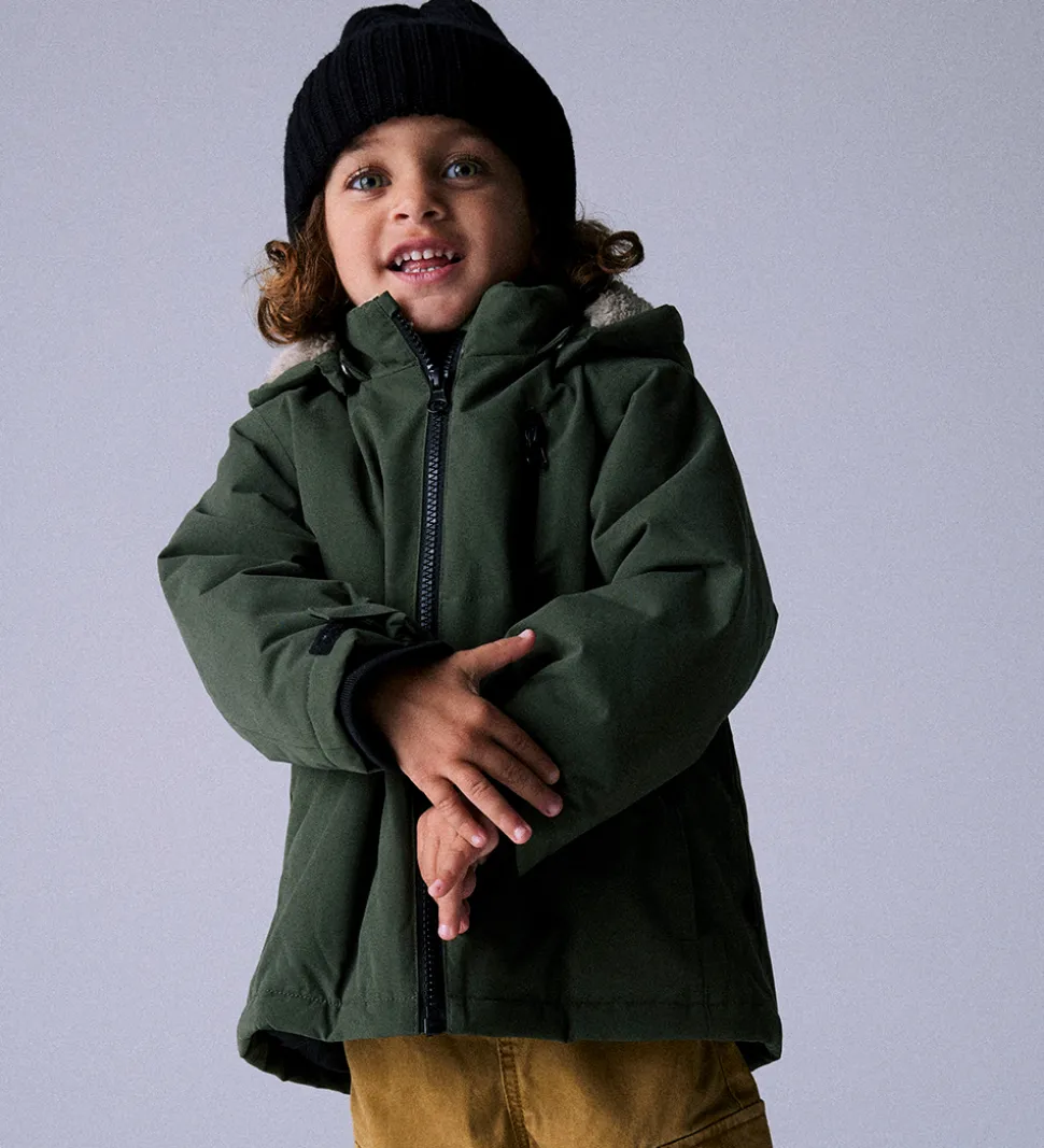 Vinterjakken har praktiske sidelommer på fronten og en lynlåslomme på brystet, og ærmerne har snefang med brede ribkanter og velcrojusteringer. Vinterjakken er foret med blødt teddyfleece i hætten og overkroppen, mens resten har et glatvævet for.